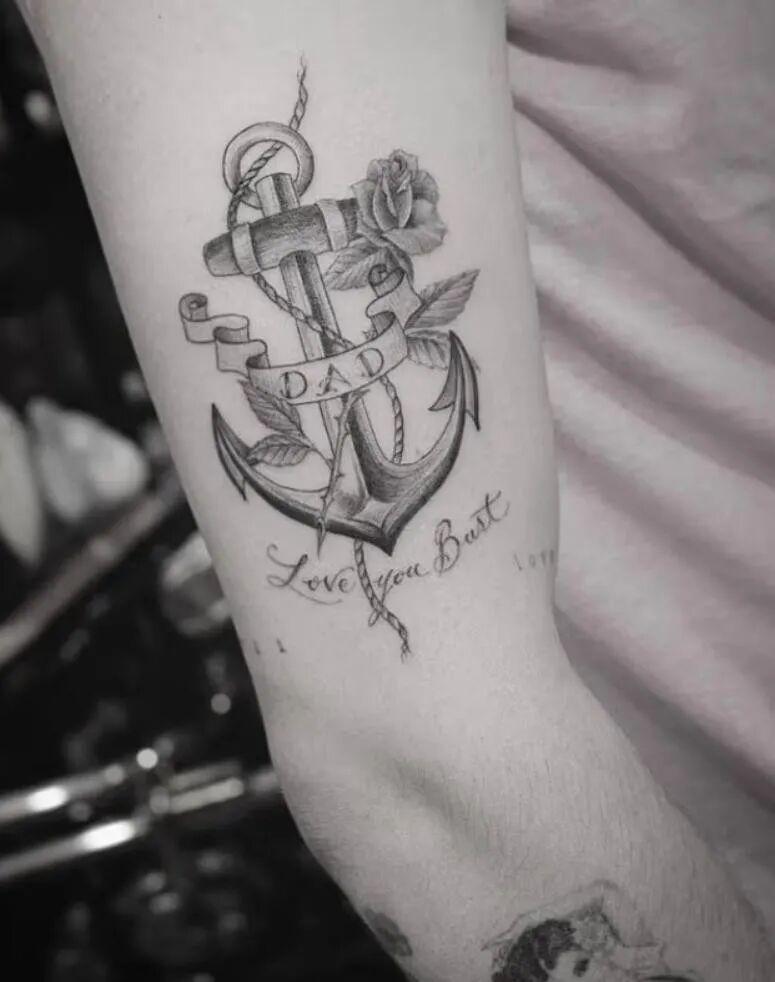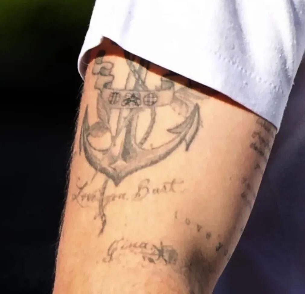 下方还有花体的“Love you bust”,Bust和Buster都是贝克汉姆小时候给大布取的昵称,这个纹身的意思就是“父亲是他人生的定心锚”。